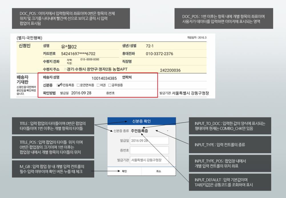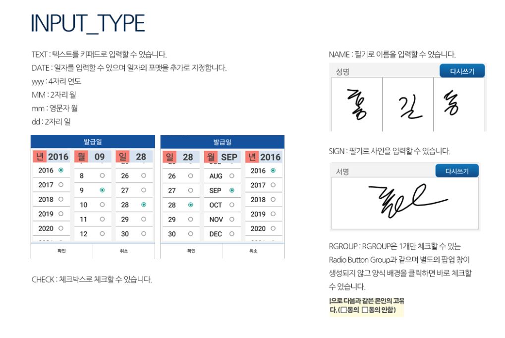 양식 작성 시 고객사 앱과 이벤트를 주고받을 수 있으며 양식 데이터 입력은 고객사 앱에서 팝업 형태로 입력합니다. 팝업 형태의 서명이나 화면에서 바로 서명을 입력할 수 있습니다.
